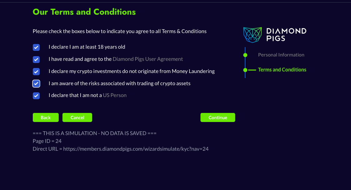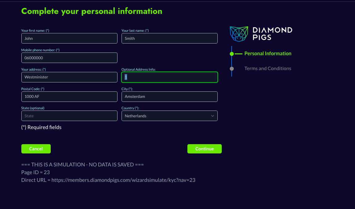 Saisissez vos informations personnelles et acceptez les conditions générales de Diamond Pigs.