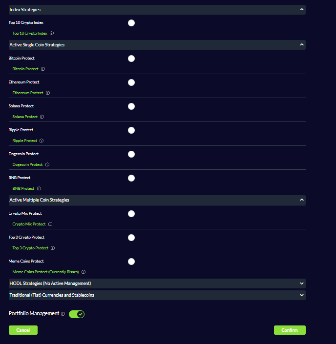 Choisissez une stratégie adaptée à vos objectifs d’investissement. Utilisez l’option Exclure des coins pour garder certains actifs hors de la gestion automatisée.